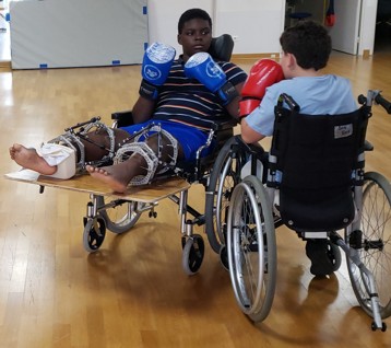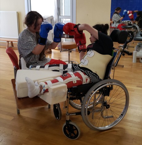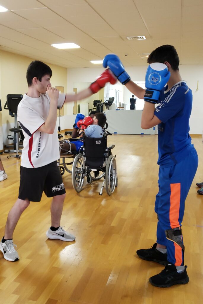 Deux groupes de six jeunes, atteints de pathologies diverses, ont participé avec enthousiasme à une séance de boxe adaptée, certains en fauteuil, d’autres marchant avec aide technique, et accompagnés par une bénévole de l’association et une enseignante en Activité Physique Adaptée.