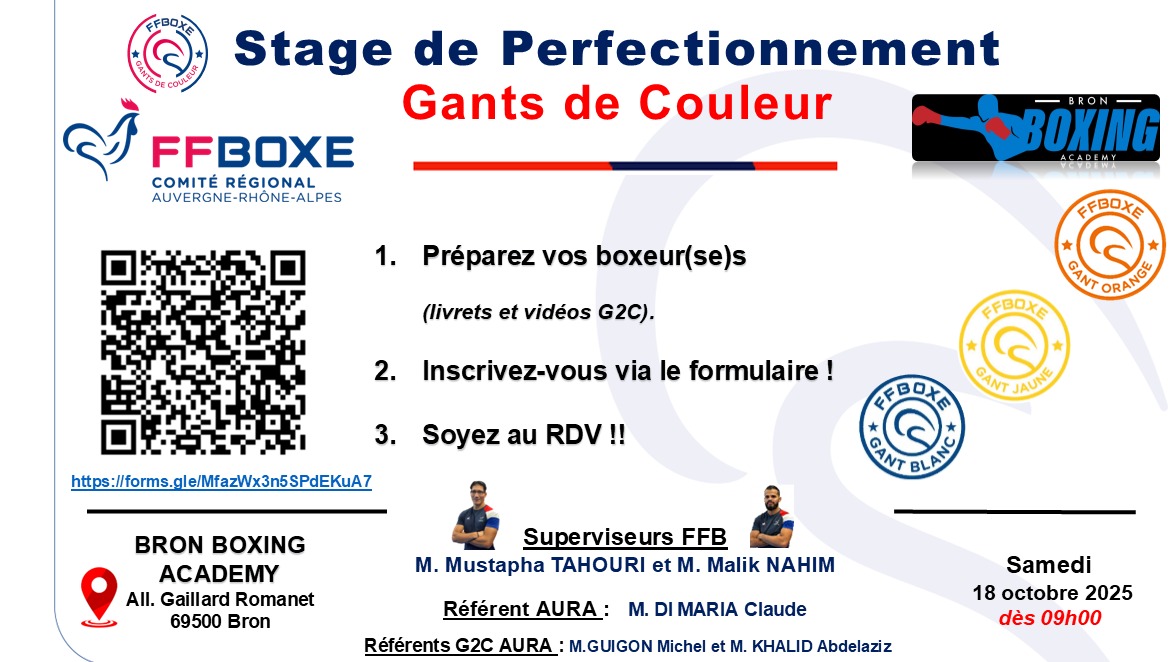 Mesdames, Messieurs, cher(e)s collègues, Dans le cadre du développement de notre discipline, le Comité Régional AURA de Boxe organise un :🥊 Stage de perfectionnement G2C 🥊le Samedi 18 octobre 2025 Ce stage est ouvert à tous les clubs, avec une