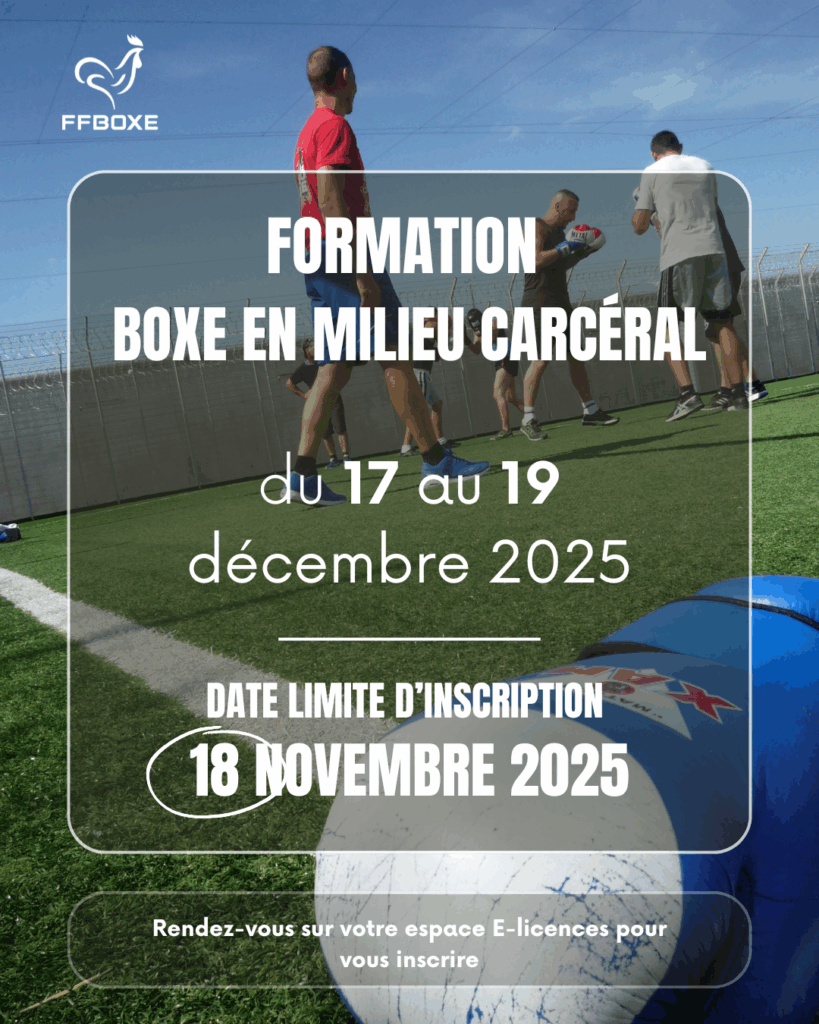 Vous souhaitez mettre en place un projet lié à la boxe en milieu carcéral et développer vos savoirs, savoir-faire et savoir être propres à l’encadrement auprès de ce public spécifique ? N’attendez plus pour vous inscrire. Rendez-vous sur E-licences jusqu’au 18 novembre 2025. »